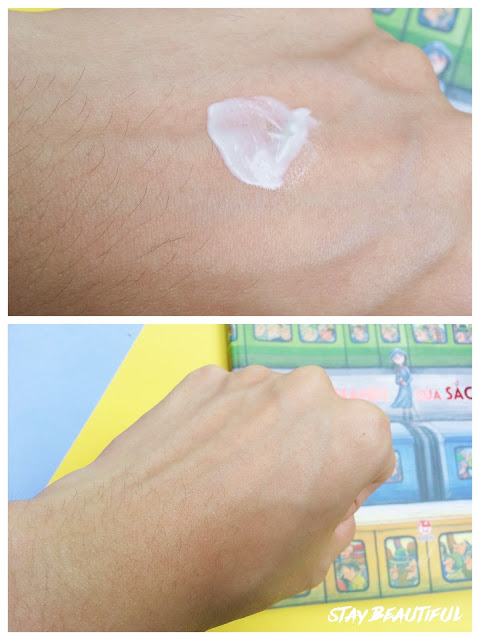 Kết cấu dạng gel lỏng trong suốt, khi tải lên mặt thì sẽ tan ra thành nước, thành ra quá trình thoa kem cứ như thoa nước lên mặt vậy :)) Độ thấm của em này khá nhanh, chỉ sau tầm mấy mươi giây là mặt đã khô ráo nhẹ nhàng rồi, không bị nặng mặt, không nhờn rít.